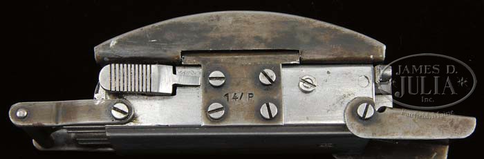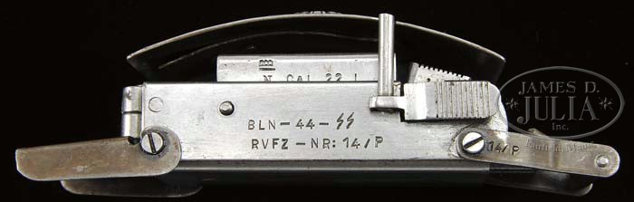 *INTERESTING GERMAN BELT BUCKLE GUN. SN 14/P. Cal. 22LR. Nefarious undercover weapon consisting of 4-bbl derringer which is hinged to hide under flip-up cover. When in desperate situation, wearer can press dual locking levers on left side of “buckle”, and the cover flips up, bbls spring outward and are locked into position by secondary lever on right side. Individual bbls can be fired by depressing four triggers on left. Cover is mounted with 3-3/4″ Nazi eagle with wreathed Swastika in talons. Bbl assembly is stamped “I. M. LOUIS MARQUIS” on front. Bottom is stamped with spurious crowned “N” proof and “CAL. 22L”. Bottom of mechanism is stamped “BLN – 44 – SS (runes)” and “RVSZ – NR: 14/P” 14/P is also stamped on other buckle parts. PROVENANCE: Red booklet describing this interesting piece, and internet info on Gov. Gordon Person of Alabama who has a similar item in his collection. CONDITION: Excellent, with artificially aged cover and belt mounts. 4-44205 MGM289 (10,000-20,000)
