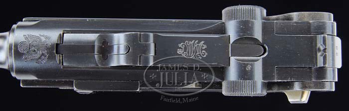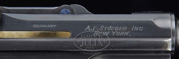 *RARE DWM 1923 STOEGER AMERICAN EAGLE LUGER. SN 8728. Cal. 30 Luger. Rare Stoeger Luger with 4-3/4″ bbl, American eagle over chamber, “A.F. STOEGER INC / NEW YORK” on right side of receiver with safety marked “SAFE” and extractor marked “LOADED”. It has “GERMANY” export stamp on bottom front of frame & right side of receiver behind Stoeger marking. There is a crown “N” proof on left side of receiver. Fitted with spectacular, full checkered. walnut grips. Magazine, bbl, hold open, firing pin & grips are unnumbered. A very rare model in near mint condition with less than 1,000 produced. PROVENANCE: Doug Smith Collection. CONDITION: Extremely fine plus, all numbered parts are matching. Overall retains about 99% strong orig blue with only faint muzzle edge wear & slight thinning on high point of sideplate, and retains about 98% orig straw colors. Grips are near mint with beautiful wood grain & sharp checkering. Grip screws retain about 98% fire blue. Aluminum base magazine is also near mint. Mechanics are crisp, pristine bore. Altogether a wonderful, near new American Eagle Luger suitable for anyone’s collection. 4-36118 JR183 & BS (10,000-12,500)