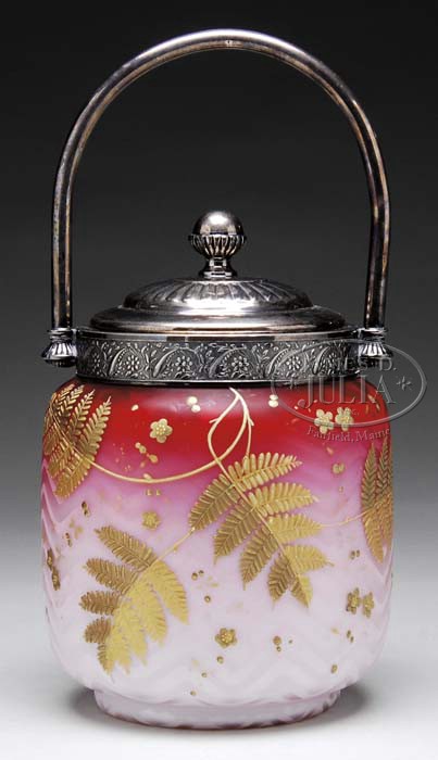 SATIN GLASS CRACKER JAR. MOP herringbone pattern satin glass cracker jar shading from a deep cranberry to a soft white with an applied enamel decoration of ferns and flower blossoms in gold. Original silver plated metal lid and bale complete this jar. SIZE: 10-1/2″ t x 5-1/4″ dia. CONDITION: Silver bale has a slight bend, otherwise very good to excellent. 5-61231 (400-600)