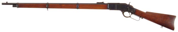 *WINCHESTER MODEL 1873 LEVER ACTION MUSKET. Cal. 44 WCF (44-40). SN 570597. Standard musket with 30” rnd bbl, full length magazine, three bands with square base front sight/bayonet lug and a 900 yard ladder rear sight. Mounted with nicely figured, uncheckered, straight grain, American walnut with full length forearm & straight stock with musket/carbine buttplate with trap. It has a sling loop on middle band and a corresponding loop on bottom of stock. CONDITION: Extremely fine plus. Retains virtually all of its brilliant finish to both metal & wood with crisp, sharp blue & vivid case colors, slightly faded on outer edges. Buttplate case colors are moderately faded. Stock has a scratch by receiver and a small scrape on forearm with a few other very minor handling & storage marks. Mechanics are crisp, brilliant shiny bore. The action still has orig grease. A pristine new example. 4-31044 JR520 (6,000-8,000)