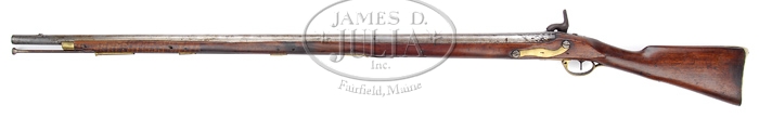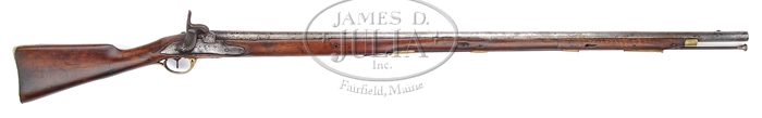 CONFEDERATE ALTERATION OF STATE OF VIRGINIA SWAN CONTRACT MUSKET. SN NSN. Cal. 69. This gun is illustrated and described in Murphy & Madaus’ book Confederate Rifles and Muskets on pp. 625-627. Mr. Michel describes this gun as follows: “This musket is one of 7,831 imported muskets delivered to Virginia by contractor James Swan of Boston during the period from 1797 to 1801. Brazed bolster alteration to percussion was done by S. C. Robinson of Richmond using the characteristic two faceted bolster. Bbl regimental markings ‘ORANGE’ are visible though indistinct. Virginia regimental marking is indistinct. All orig throughout.” CONDITION: Bbl and lock are gray/brown with pitting. Brass nosecap, ramrod thimbles, trigger guard, and buttplate are all cleaned with scattered scratches and patina in protected areas. Ramrod is replaced. Last 10″ of stock toward muzzle is restored. Stock otherwise is sound and solid with a 3″ repair of bottom of forestock forward of hammer. County bbl markings are weak but “Orange” is discernible. 4-31262 JS193 (3,000-5,000)
