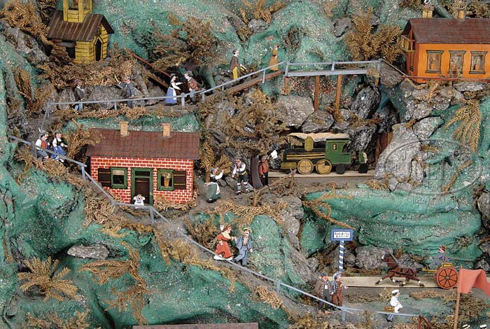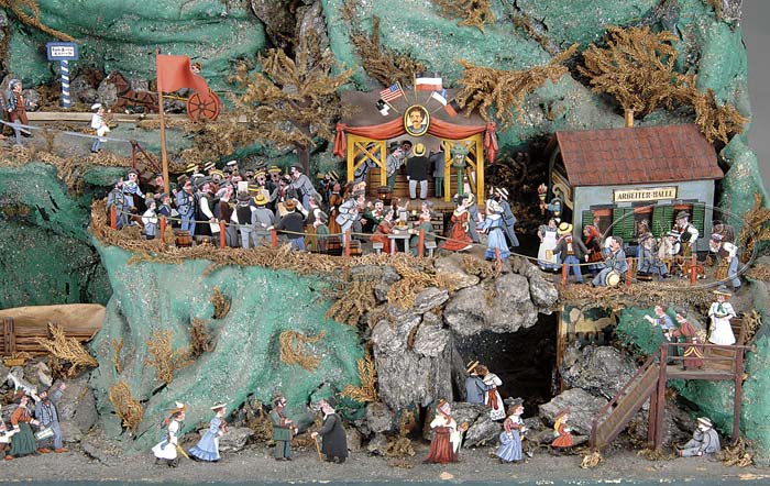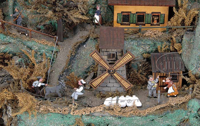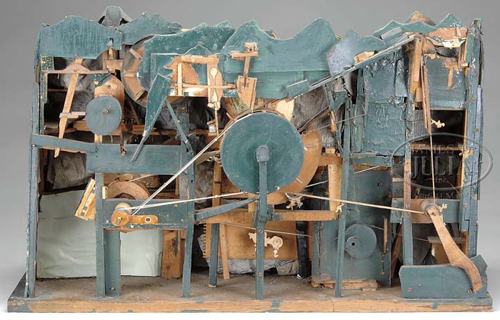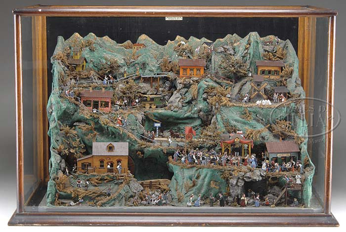 SPECTACULAR FOLK ART AUTOMATED DISPLAY. Circa early 20th Century, this exceptional and unique automated diorama of a busy mountain scene boasts a cast of scores of citizens in a variety of activities. This papier mache and wood display also utilizes old cigar boxes and other found materials and depicts mountain climbers, farmers, mill workers, lovers having a romantic interlude, a political candidate’s speech with a lively crowd of onlookers, churchgoers, and more. A single crank in the back sets into motion a series of actions including a moving train in the distance, water wheels, and animating a selection of characters. Because an American flag is seen among the German and other flags, the piece is believed to be American made perhaps by a German or European immigrant because of the Alpine theme and use of American materials. Housed in an old glass and wood showcase that though not original, serves as a great means of display and protection from dust. SIZE: 33″ l x 22″ h x 13″ d. CONDITION: Overall very good. It is unknown if it is complete. It is possible there have been some minor repairs over the years. 1-11234 (1,500-2,000) Auction: Advertising, Toy & Doll - Fall 2011 Please Note: All prices include the hammer price plus the buyer’s premium, which is paid by the buyer as part of the purchase price. The prices noted here after the auction are considered unofficial and do not become official until after the 46th day. |
