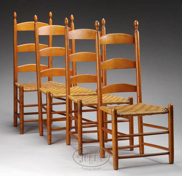 ASSEMBLED SET OF FOUR SHAKER LADDER-BACK SIDE CHAIRS. Each chair with three slat backs, turned finials with one slightly different. All are maple with some figuring. Splint seats and double box stretcher. One chair is marked “10” on front leg post. Nice consistent older honey brown finish. Comes with four removable modern cushions. SIZE: 39” h x 15” seat h. CONDITION: Restored, some conversion at bottom of legs. 9-73365 (600-1,000)