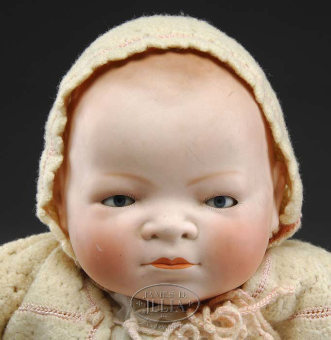 LARGE BYE-LO BABY. 20″, (51 cm) long, with 16-1/2″, (42 cm) head circumference with head incised “COPR. BY GRACE STOREY PUTNAM”. This flange neck bisque head baby has blue glass sleep eyes, closed mouth, original cloth body stamped in red on the torso “BYE-LO-BABY ETC.” with celluloid hands. CONDITION: Head in excellent condition, six fingers broken, but present. 1-7213 RS (500-700) Auction: Advertising, Toy & Doll - Spring 2007 Please Note: All prices include the hammer price plus the buyer’s premium, which is paid by the buyer as part of the purchase price. The prices noted here after the auction are considered unofficial and do not become official until after the 46th day. |