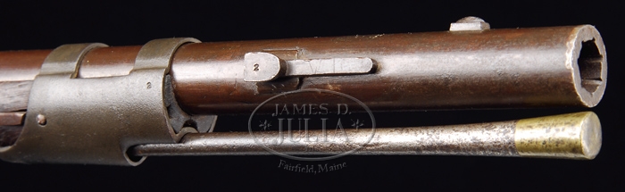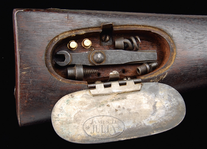 CONFEDERATE ALTERATION OF MODEL 1817 U.S. RIFLE. SN NSN. Cal. 54. Mr. Michel describes this gun as follows: “Alteration to percussion of Model 1817 made by N. Starr & Co. Lockplate marked forward of hammer ‘N. Starr & Co’ in arch over ‘US’ and at tail, ‘Middtn / Conn / 1843′. In addition to the alteration to percussion, the forestock has been altered by removing the middle band, creating the appearance of a two-band rifle and in addition insetting a saber bayonet lug with guide key onto the barrel. Brazed bolster of unique design with a vertical rear and horizontal bottom is believed to be the work of William B. and Cyrus Fisher of Lynchburg, Virginia. Ex-James Artimus collection.” This Confederate percussion alteration is pictured and described on pp. 227-230 in Murphy & Madaus’ Confederate Rifles and Muskets. This gun is in fine, untouched condition with a fine, rifled bore and orig finish on much of the gun. This is a most unusual conversion. Not only was ignition system changed from flint to percussion, the overall gun was “modernized” by relocating the front band sufficiently far back such that the middle band could be eliminated and a brazed saber bayonet lug was attached for use of saber bayonet. You are bidding on a superb condition, possibly unique restoration by Lynchburg, Virginia gunsmiths that is completely orig, authentic, and complete. CONDITION: Bbl is smooth and brown with some orig brown finish. Slight rust and pitting at bolster. Bbl markings are very clear. Lock was cleaned, probably during conversion. Lock retains good surfaces, but orig U.S. markings are weak and partially obscured. Other metal components including trigger guard and buttplate are smooth with some orig finish. Rear band is uncleaned, gray, with traces of finish. Front band has a mottled, cast appearance. Small “2” is stamped in face of front band and also on bayonet lug, which was added during alteration. Accompanying ramrod is brass-tipped Mississippi. It is gray and pitted. Stock is very good, showing orig varnish, scattered dings and scratches, and residual cartouches from orig flint inspection. Patchbox contains extra nipple, cleaning jag, worm, and nipple wrench/screwdriver combination tool. Rifling and bore are very good. 4-31302 JS189 (4,000-8,000)