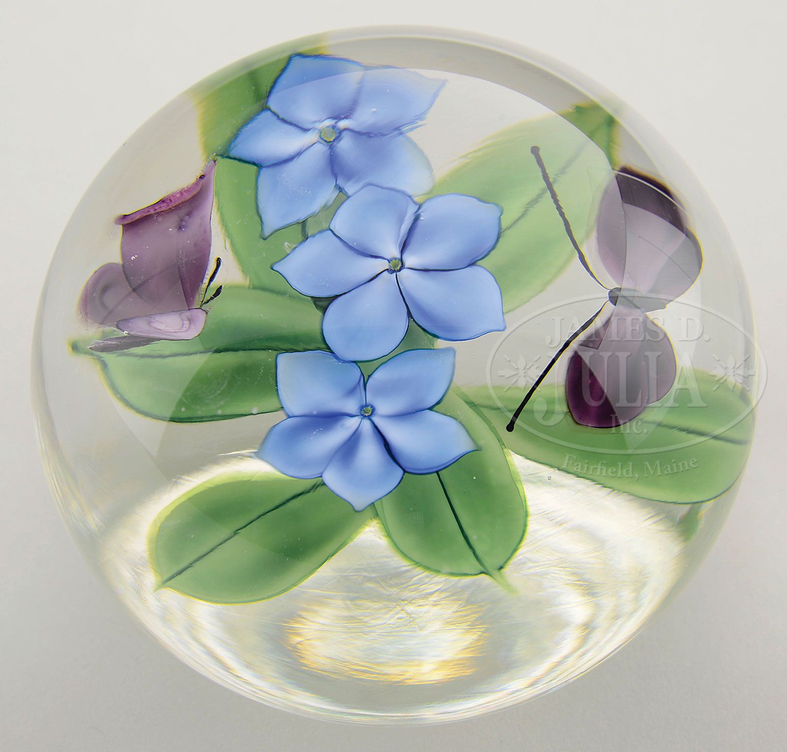 DANIEL SALAZAR FLORAL BOUQUET PAPERWEIGHT. Three blue flower blossoms and two hovering amethyst butterflies with green leaves comprise this compound bouquet. Signed in script on underside “Daniel Salazar Lundberg Studios 1986 120307”. SIZE: 3″ dia x 2-3/4″ t. CONDITION: Very good to excellent. 5-65449 (200-300)
