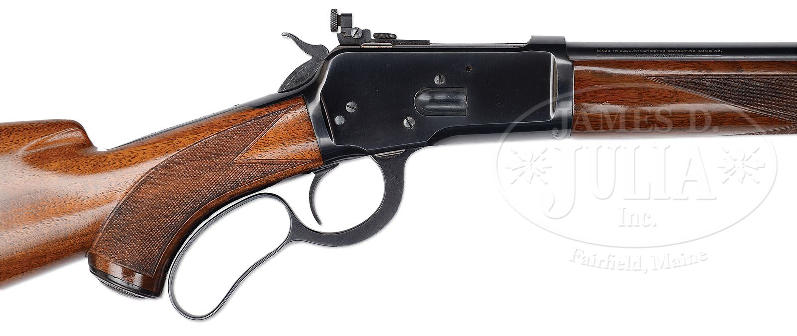 *RARE WINCHESTER DELUXE MODEL 65 LEVER ACTION RIFLE. SN 1004828. Cal. 218 Bee. Deluxe rifle with 24-1/4″ tapered rnd bbl, button magazine & ramp front sight with hood, slot blank in the rear seat & scarce bolt peep. Mounted with straight grain American walnut that has H-style checkered semi-beavertail forearm & capped pistol grip stock with checkered steel buttplate. One of the most rare of all Winchester lever action rifles, the model 65 was produced only from 1933 to 1947 and only 5,704 rifles were manufactured in 3 calibers in both standard & deluxe versions, very few in deluxe configuration. These slim, trim, well balanced rifles, while popular were slow to sell during the great American Depression and fell completely out of favor post WWII with only those few rifles produced. Very few are found today with crisp, orig finish. PROVENANCE: Woody Frey Collection. CONDITION: Extremely fine plus, all orig. Overall retains 99% plus crisp, orig finish with bright factory blue & brilliant factory varnish on the wood. Mechanics are crisp, brilliant shiny bore, appears to be new & unfired. 4-48460 JR230 (6,000-10,000)