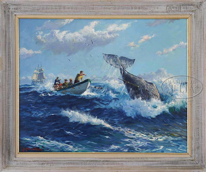 J.J. ENWRIGHT (HJALMAR AMUNDSEN) (American, 1911-2001) HARPOONING THE WHALE. Oil on canvas whaling scene shows a sperm whale being harpooned by a man at the front of a green and white rowboat with five other men while the whaling ship waits in the distance. All under a blue sky with scattered clouds. Signed lower left “H Amundsen”. Housed in a decorated wood frame with gilt and linen liner. A wonderful rendered whaling scene. SIZE: 24″ x 30″. CONDITION: Very good. 9-97892 (2,000-3,000)