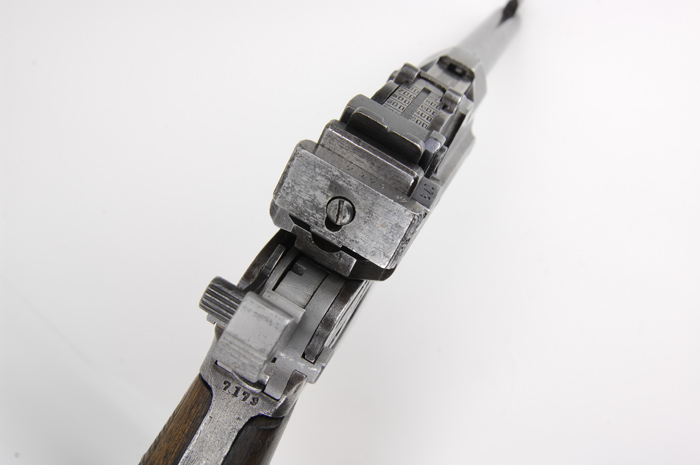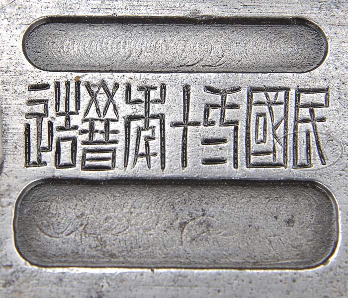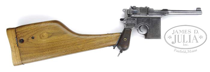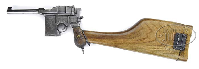 *RARE CHINESE SHANSEI ARSENAL COPY OF BROOMHANDLE MAUSER. SN 7179. Cal. 45 ACP. One of the very few Chinese made broomhandle pistols produced in 1931 at the Shansei Arsenal in China with 5-1/2″ tapered rnd bbl, long barleycorn front sight & 100-1,000 meter rear sight. Sides of frame have Mauser style milling cuts with Chinese characters on both sides. Grips are serrated walnut and it has a stud & ring in butt. Accompanied by an orig Chinese-made walnut holster/stock. This gun is pictured on p. 256 of the book The Broomhandle Pistol 1896-1936, Erickson & Pate. Approx. 8,000 of these rare pistols were made & used by the Chinese prior to and during WWII, few survive today, especially with orig shoulder stocks. CONDITION: Fine, all matching, grips & stock are unnumbered. Metal has an unfinished gray color and appears to have never been finished with a few nicks & dings. Grips show moderate wear with nicks & scratches. Mechanics are fine, strong bright bore with scattered light pitting. Stock is very fine and retains most of an old restored finish. 4-45625 (4,000-6,000)