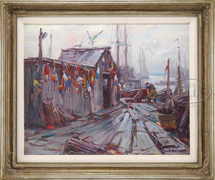 EMILE A. GRUPPE (American, 1896-1978) “LOBSTER SHACKS”. Oil on canvasboard harbor scene shows a lobsterman tending to his traps beside a connected lobster shack decorated with colorful buoys. Two seagulls are atop roof and several schooners can be seen in the harbor. Signed lower right. Titled on reverse. Housed in a silver gilt frame with linen liner. SIZE: 16″ x 20″. CONDITION: Very good. 9-98208 (7,000-9,000)