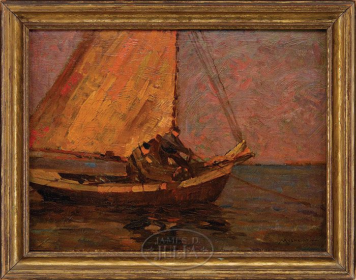 FREDERICK JOHN MULHAUPT (American 1871-1938) FISHING SCHOONER. Oil on board scene shows two men on a single mast fishing schooner hauling in a line. Colorful sky indicates an early evening job. Signed lower right. Housed in a gold period frame. SIZE: 12″ x 16″. CONDITION: Very good. 9-27070 (4,500-6,500)