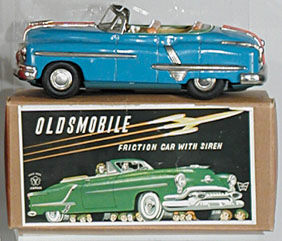 OLD OLDSMOBILE FRICTION CAR IN ORIGINAL BOX. This is a Japanese friction car probably from the late 1940’s possibly from the early ’50’s. Its blue with an orange red pin stripe down the middle and with lots of nickel-plate ornamentation. The hood ornament is of a jet. It has old black rubber tires. It is in the original cardboard box which has a colored litho label on the lid. SIZE: 10″ long. CONDITION: Generally very good to excellent condition. The box has a 2″ break in the side. The car works. 1-27528 (500-700) Auction: Advertising, Toy & Doll - Fall 2001 Please Note: All prices include the hammer price plus the buyer’s premium, which is paid by the buyer as part of the purchase price. The prices noted here after the auction are considered unofficial and do not become official until after the 46th day. |