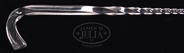 LOT OF FOUR GLASS CANES WITH COLOR SWIRLS. 1) 45-1/2″ with loop handle with twisted shaft in colors of red, white and light blue. 2) 47″ with hook handle, twisted shaft with colors of white, red and blue stripes. 3) 43-1/4″ loop handle with red, white and blue stripes. 4) 48″ knob top walking stick with blue, white, red and green stripes. SIZE: As noted above. CONDITION: Some roughness to bottom tips, otherwise very good. 9-93724 (600-900)