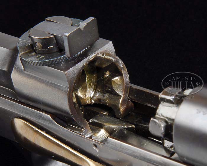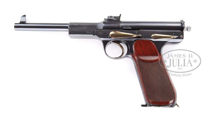 Correction It has been brought to our attention that this gun may be a prototype and may also be a period of use refinish (?). Due to the rarity of this gun, there are no comparisons available to us. RARE SCHWARZLOSE MODEL 1898 STANDARD MODEL SEMI-AUTO PISTOL. SN 100. Cal. 7.63 mm Mauser (30 Mauser). Wonderfully made semi-auto pistol that is almost never encountered in the U.S. This pistol was patented in 1896 with production through about 1905 but very few were sold outside of Germany. In 1905 the company found themselves with a large stock of unsold pistols which were then bought by the Russian revolutionaries in preparation for the 1905 revolution, which took place during the Russo-Japanese War. The majority of the Russian Revolutionary purchase, while in transit, was confiscated at the frontier and eventually issued to the Russian Imperial Police. Very few of these rare pistols have ever re-emerged and those that have are usually in only average to poor condition with Russian inscriptions. This being doubly rare in that the condition is extremely fine and also not defaced with the added Russian markings. This pistol has a 6″ tapered rnd bbl with tall integral front sight and adjustable rear sight graduated 1-500 meters, mounted over the chamber area. This pistol is striker fired with a most unusual rotating bolt and recoiling bbl system. It has a thumb safety and take down lever on left side of frame with very curved trigger. Mounted with checkered 2-pc walnut grips that are secured with screws through the integral buttcap. Magazine capacity is about 7-rds and is made of heavy gauge stamped sheet metal with flush pinned base and a dbl sided knurl knob to retract the follower when loading. Magazine release is a push forward lever in the heel of the back strap. This pistol was very innovative for its time and was the first semi-auto with an automatic hold-open on firing of the last round in the magazine. Unfortunately their mechanism is rather complicated and although not delicate, required constant maintenance to remain functional. Accompanied by a copy of a reprint of the manual and several pages from the book Textbook of Automatic Pistols. CONDITION: Extremely fine plus, all visible numbers are matching. Overall retains 99% + strong orig factory finish with fine rust blue and bright straw colors. Grips are sound showing very minor diamond point wear and retain virtually all of their orig varnish. Mechanics are fine, bright shiny bore. 4-39293 JR109 (15,000-25,000)