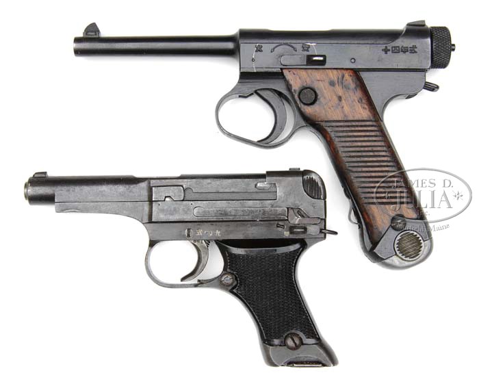 *TWO JAPANESE HAND GUNS: TYPE 94 AND TYPE 14 NAMBU WITH HOLSTER. SN 31681/ 31924. Cal. 8 mm. Type 94. Nagoya Arsenal 1942 production, with Bakelite checkered grips. Matching magazine numbered “681”. Condition: Probable factory refinish over considerable pinprick pitting. SN 31924. Cal. 8 mm Nambu. Type 14. Nagoya Arsenal 1944 production Type 14 with matching magazine and spare magazine numbered “857”, and rubberized canvas holster, with cleaning/ takedown tool, and spare firing pin, is marked with Japanese characters on cover. Ammo pouch contains small Japanese flag. Condition: Excellent, as properly refinished, retaining nearly all blue over scattered pinprick pitting, and a shell fragment hit on right side of receiver. Holster is somewhat soiled, leather trim considerably flaked. Carrying strap is de-laminating. CONDITION: As above. 4-44208, 44209 MGM271 (1,000-2,000)