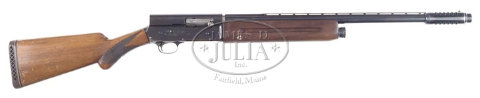 *BROWNING A5 SEMI-AUTO SHOTGUN. Cal. 12 ga. SN G2539. Fine old Browning with light 12 receiver & ventilated rib bbl that has been cut to add a Cutts Compensator. It has a checkered round knob stock & a replacement, probably Remington, uncheckered military style forearm. CONDITION: As noted, the forearm does not fit properly & will not allow the bbl to seat completely therefore making it unsafe to fire in this condition. Bbl retains about 90% orig blue & the receiver 88-90% with light surface rust. Buttstock retains about 90% orig varnish. Forearm has two cracks & retains an even oil finish. Buttstock has an old brown waffle pad. Bright shiny bore. 4-50216 JR750 (200-400)