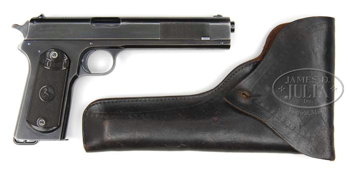 *COLT MODEL 1902 MILITARY SEMI-AUTO PISTOL. SN 13108. Cal. 38 ACP. Blue finish with 6″ bbl, fixed sights with slightly altered front sight. Slide has second type markings on left side which includes “BROWNING’S PATENT” with the rampant Colt in a circle at the left rear end. Right side has usual markings with “MODEL 1902”. Slide has forward checkered serrations. Left side of frame has a slide lock with lanyard loop in left heel. Mounted with rampant Colt hard rubber grips and accompanied by one all blue magazine with patent date on the base. Right side of magazine is hand scratched “P.H. CHASE HANOVER NH”. Accompanied by a period, mail order, black leather flap holster with brass stud closure. There were about 18,000 of these fine pistols produced in the period 1902-1929. They were popular with the population in general with the Army purchasing about 200. They remained in service well into the 1950s and even later due to their popularity with target shooters because of their inherent accuracy. Few are found today in orig configuration with high orig finish. CONDITION: Very fine. Slide retains about 93-95% glossy orig blue with muzzle end wear and a thin spot over the top; frame retains about 95-96% glossy orig blue, slightly thinned on front & back straps, more so on back strap; trigger retains bright fire blue on sides and hammer most of its bright case colors; grips are sound showing light diamond point wear. Mechanics are crisp, bright shiny bore. Holster is sound and retains most of its orig finish with some light crackling on hinge of flap. 4-45031 (4,000-7,000)