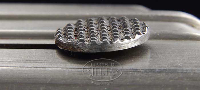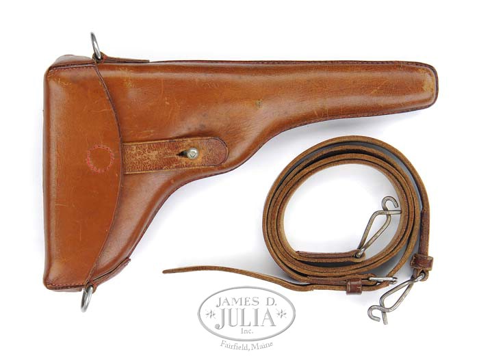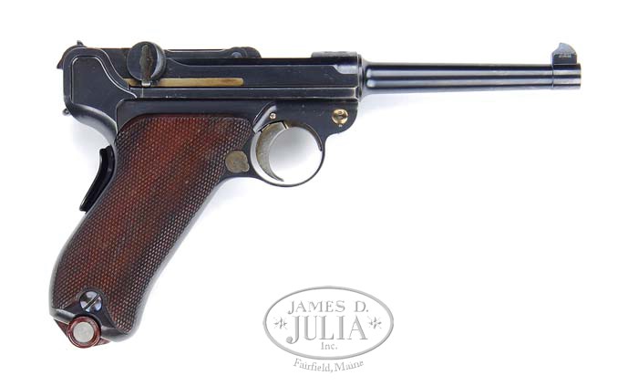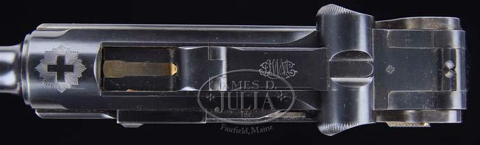 *SPECTACULAR & RARE EARLY MODEL 1900 DWM SWISS LUGER WITH UNRELIEVED FRAME & HOLSTER RIG. SN 366. Cal. 30 Luger. Fabulous early 1900 Swiss Luger with 4-3/4″ bbl, dished toggles, narrow grip safety & narrow trigger with DWM scroll on front toggle link and Geneva cross & sunburst over chamber. This is a very low 3-digit military serial number with orig unrelieved frame. Fitted with matching numbered, full checkered wood grips & an orig flat button Swiss magazine with steel disks. Accompanied by an orig, correct brown leather holster complete with shoulder strap. Back of holster is marked “L.J. WALTHER / SATTLER BERN” in an oval cartouche with “02” in center. To find such an early Luger in near pristine orig condition is extremely difficult & would be a fine addition to any collection. PROVENANCE: Doug Smith Collection CONDITION: Extraordinarily fine, all matching including grips except hold open & firing pin which are properly unnumbered. Overall retains about 98-99% strong orig factory blue & about 98% strong orig factory straw colors. Rear sight retains orig V-notch which has not been modified to a “U”- shape which was commonly done by the Swiss. Grips are crisp with minor light wear & good wood grain showing through. Grip screws retain about 70% orig fire blue. Magazine is near mint. Mechanics are crisp, brilliant shiny bore. Holster is extremely fine with some minor scuffing & light wear with flaking on shoulder strap. 4-36099 JR200 & BS (15,000-20,000)
