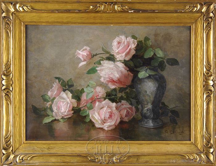 ANNA ELIZA HARDY (American, 1839-1934) PINK ROSES AND VASE. Oil on canvas still life scene shows a bulbous vase with three pink roses and green leaves with five pink roses and leaves set beside the vase. All against a light gray background with light reflection off of the tabletop. Signed bottom right “A E Hardy”. Housed in a period gilt and carved wood frame. On reverse of stretcher is a “W. H Gorham” framers label from Bangor, Maine. SIZE: 14″ x 20″. PROVENANCE: Wedding gift from the artist to Christine Peirce of Bangor, Maine, 1913. Descended to Gordan Douglas from the Estate of his mother, Christine Peirce Douglas, 1979 to his daughter, 2006. CONDITION: Very good. 9-95805 (4,000-6,000)