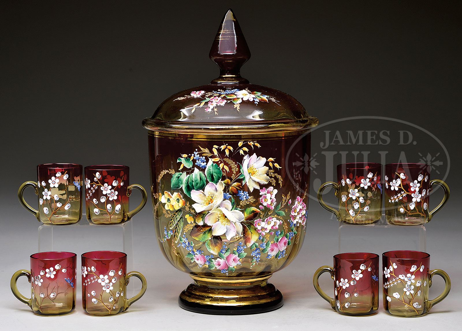 MOSER AMBERINA DECORATED PUNCH SET. Amberina punch set has covered punch bowl with lightly ribbed body and decorated with applied and enameled flowers with white, pink and blue petals with nicely detailed shaded green, brown and yellow leaves. The punch bowl is finished with a matching decorated lid with conical finial and gilded trim. The punch bowl is accompanied by eight Amberina punch cups with enameled white, red and blue flowers with a blue dragonfly on the side. Each cup is finished with an applied amber glass handle. Unsigned. Punch bowl is numbered “1.O.1721.” SIZE: Punch bowl is 15″ to top of finial. Cups are 2-3/4″ t. CONDITION: Very good to excellent with some minor wear to gilded trim and some minor roughness to ladle opening on lid. No ladle present. 9-90113 (750-1,500)