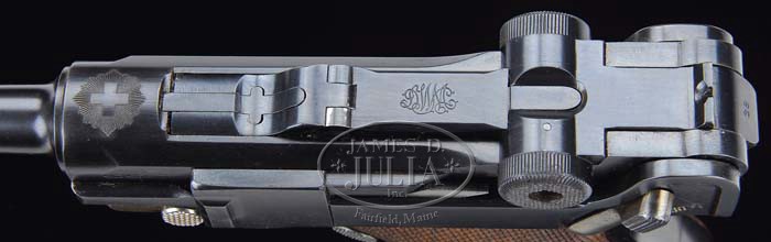 *RARE DWM 1906 SWISS COMMERCIAL LUGER “GESICHERT” MARKED IN LOWER POSITION. SN 26188. Cal. 30 Luger. Rare Swiss Luger with 4-3/4″ bbl, DWM scroll on front toggle link, Geneva cross & sunburst over chamber & “GESICHERT” marked safety which only appears on Lugers with serial number above 25,000. It has grip safety, “BUG” proofs on bottom of bbl, “BU” proofs on left side of breech block & front toggle link with “172.28” under bbl, which indicates the caliber in the old English system (the number of lead bullets of that diameter that would weigh one pound). It has correct wood base magazine. This is a very rare Swiss model Luger in super condition. PROVENANCE: Doug Smith Collection. CONDITION: Exceptionally fine, all matching including grips except magazine, hold open & firing pin which are properly unnumbered. Overall retains about 99% strong orig factory blue & about 98% strong orig straw colors, thin on safety lever. Grips are extremely fine & sharp with only minor, extremely light wear & a light bruise on right side with attractive visible wood grain. Magazine is near mint. Crisp mechanics, brilliant shiny bore, possibly unfired. 4-36103 JR203 & BS (12,500-17,500)