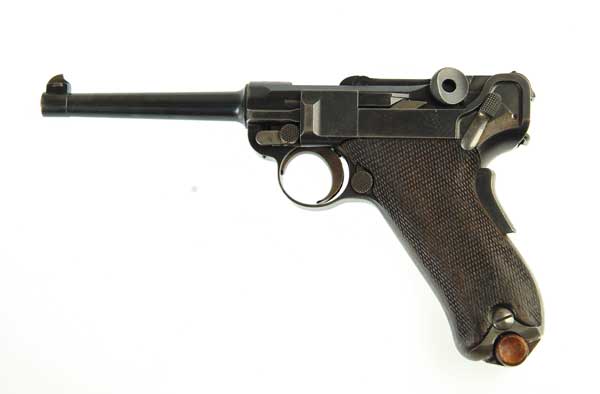 *1900 AMERICAN EAGLE LUGER. Cal. 30 Luger. Usual configuration with 4-3/4” bbl and American eagle over the chamber with “DWM” toggle link, full-checkered walnut grips and an unmarked stainless body magazine. Without proofs and has “Germany” below the serial number on the frame. SN 9795. CONDITION: Very fine plus, all matching including the grips. Bbl and receiver retain 95-97% strong bright blue with a small scratch and spot of pitting on the left side of bbl. The bolt, toggle and link retain 95-97% original blue. The frame retains about 60% original blue with the front and back straps silver-blue with fine pitting on the front strap. The side plate retains about 80% blue. Grips are fine, showing moderate to heavy wear, more so on the left side. Retains 50-60% straw colors with the safety having only traces of color. The magazine is fine. Strong bright bore with fine pitting. 4-49339 JR361 (2,500-3,500)