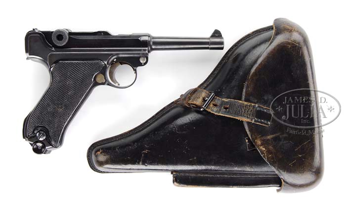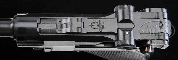*KRIEGHOFF SECOND SERIES COMMERCIAL LUGER WITH HOLSTER AND SPARE MAG. SN P33. Cal. 30 Luger. 4″ Barrel has post 1939 nitro proof on bottom. Receiver is unmarked except for proof and “33” on left side. Frame is marked “Gesichert” with safety lever in down position, has SN on front, nitro proof on left side, and Krieghoff parts proof on right. “610” is stamped in front well. All small parts are unnumbered, except trigger, which is numbered “53”. Unnumbered toggle assembly has Krieghoff, “HK”, and anchor logo, and is stamped “Krieghoff Suhl” on center link. Extractor is marked “Geladen”. Breech block has nitro proof, and Krieghoff parts proof. Unnumbered sideplate has parts proof, as does trigger lever. Grips are molded black plastic with coarse checkering. Unmarked extruded blued magazine has Bakelite plug. Black leather military type holster has Waffenampt and “2” under flap. Inside flat is marked in pencil “Webert” and “Bad Kissingen”. Spare tin-plated magazine has beech base plug marked “2739” and “+”. CONDITION: Excellent, showing only the very slightest wear of the original dark salt-blue; mostly at muzzle, front of frame, sharp edges, and trigger lever boss of sideplate. Strawed parts show slight silvering on right side of trigger. Grip screws show use, with slight silvering of their fire blue, mostly on right side. Bore is excellent, bright and shiny. Excellent holster shows a number of light marks and scuffs. Black is thinning, and has not been re-polished. Spare mag is browning with some chips to base plug. Very fine example of this scarce variation with a very low number. Kenyon states in his book LUGERS AT RANDOM (1969) that the lowest serial number reported is P 46. 4-39187 MGM88 (14,000-18,000)