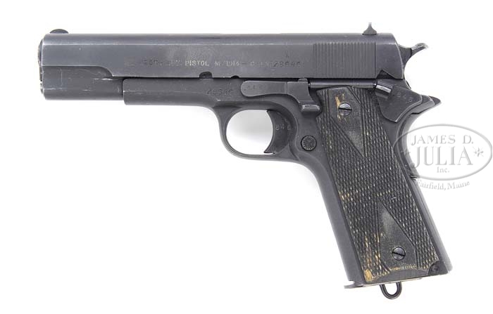 *NORWEGIAN MODEL 1914 SEMI-AUTO PISTOL WITH NAZI MARKINGS. SN 29646. Cal. 11.25 mm (45 ACP). Matte black oxide finish. Colt licensed clone with 5″ bbl, matching numbered to this pistol with Nazi waffenampt “WaA 64″(?). Left side of slide has usual Norwegian markings with the Nazi waffenampt toward the front and a crown “K” proof over serial number. Right side of slide is dated “1945”. Most visible parts are matching numbered and it is fitted with black painted diamond checkered wood grips. It has a short grip safety spur with checkered wide spur hammer and straight smooth mainspring housing. Accompanied by an orig black leather Norwegian military holster, a black leather 3-pocket magazine pouch containing three spare orig nickel plated lanyard loop magazines plus the magazine in the pistol. Also accompanied by an extremely rare & unusual conversion kit for firing 22 cartridges which consists of a bbl numbered “222” with fixed lug and six sub-caliber adapters. PROVENANCE: Carl Metz Collection. CONDITION: Pistol is very fine plus. Overall retains about all of its fine black phosphate finish, possibly an old arsenal redo. Grips show moderate wear. Mechanics are crisp, bright shiny bore. Holster is sound & supple and retains most of its orig black finish as does magazine pouch. All four magazines are very fine as is the conversion unit. 4-38450 JR46 (3,000-5,000)