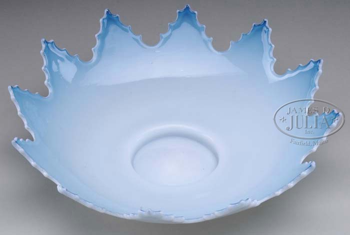 BRIDES BASKET BOWL. Unusual shape brides bowl has deep turquoise receding to soft aqua coloration. SIZE: 9-1/2″ x 2-1/2″ t. CONDITION: Very good to excellent. 5-64314 (25-50)