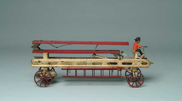 W/UP FIRE AND LADDER TRUCK. Wilkins, U. S. A. Pressed steel ladder truck rolls forward on diecast wheels with tin driver. Bump action causes ladders to elevate. SIZE: 18-1/2” l. CONDITION: Complete and working with all original paint. Averaging good. 1-1854 (350-600) Auction: Advertising, Toy & Doll - Fall 2003 Please Note: All prices include the hammer price plus the buyer’s premium, which is paid by the buyer as part of the purchase price. The prices noted here after the auction are considered unofficial and do not become official until after the 46th day. |