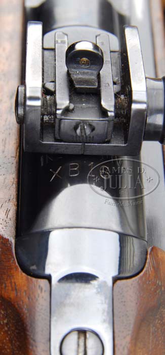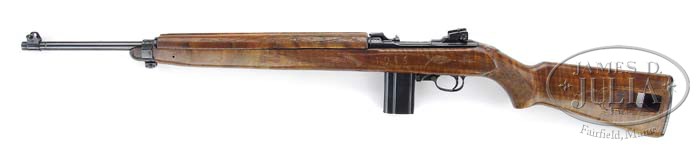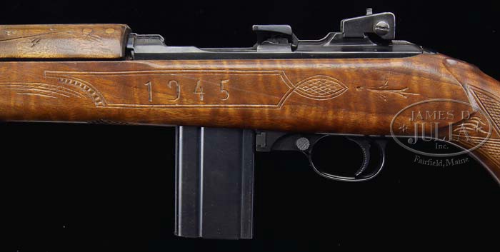 *INLAND XB SERIES PRESENTATION CARBINE WITH EXTRA LONG BBL. SN XB16. Cal. 30. 21-5/8″ bbl and extra long wood. This presentation carbine was manufactured and given out by the Inland division of General Motors. It is a high-polish blue finish, except where otherwise noted, and retains all Inland parts, including the custom made stock and handguard. The receiver retains the U.S. legend on the front receiver ring with the rear of receiver being marked “INLAND” over “XB16”. The extra long bbl retains an Inland front sight with no bbl markings and a swaged gas cylinder assembly that is similar to a Rock-ola. Front bbl band is a Type 2 that is unmarked with the provision for the sling swivel removed. Rear sight is a Type 2, milled with “PI” marking. Trigger housing has a barely legible (polished) Inland logo with a serrated magazine catch, checkered safety, checkered trigger and Type 2 dog-leg hammer. Operating slide is a Type B with “PI” stamping and is checkered at the grasping handle. Butt stock is assembled from two pieces and is jointed together 6-5/8″ in front of the magazine cut-out and 8-3/4″ from the front tip in a very fine overlapping style with a reinforcing insert on each side. Stock is carved and checkered throughout with the date of “1945” on the left side. It appears that there was a plaque on the right side of the receiver that has since fallen out of the recess. Stock also has a relief carving of an eagle in flight with the Inland shield grasped in his talons. Handguard is also handmade and is 12-5/8″ long, not counting the tin, and is also carved with the Inland shield in the sight groove. PROVENANCE: Tom Clinton Collection. CONDITION: Barreled receiver retains approx. 95% of the high-polish blue with some slight wear from being fired and also a small, approx. 1/2″ round rust spot underneath the bbl band. Trigger housing also retains better than 95% of the same high-polish blue, with only the hammer retaining factory blue. Bolt and operating slide also show better than 95% of the high-polish blue, with the body of the slide not being polished. Butt stock and handguard are in excellent condition, with only the slightest of scuffing at all, with the recoil shield and butt plate showing about all of their bright blued finish. Mechanics are crisp, bore is bright and shiny. Magazine is a standard “IS” marked. A very interesting carbine that I truly wish I had some history on. 4-37342 BK29 (4,000-8,000)