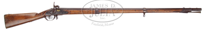 CONFEDERATE ALTERATION OF MODEL 1816 POMEROY MUSKET. SN NSN. Cal. 69. Mr. Michel describes this gun as follows: “Confederate alteration of Model 1816 Pomeroy. Alteration by brazing a raised platform on right side of breech of bbl for insertion of nipple (a reinforced ‘cone in bbl’ alteration). Cut off outside surface of pan is stamped with number ’37’. This number is also stamped inside hammer. Lockplate marked forward of hammer with eagle over ‘US’ and at tail, ‘1818’”. You are bidding on an “attic” condition, Confederate alteration of unknown manufacture which is nicely preserved. CONDITION: Metal surfaces with exception of replaced ramrod are brown, uncleaned with staining and pitting. Stock is solid with numerous scratches, dents, and dings. Hairline crack is found opposite lock. About 1″ x 1/2″ piece of wood is missing from ramrod channel. 4-31266 JS205 (3,000-5,000)