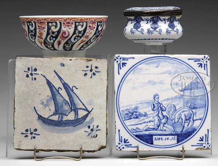 TWO DELFT TILES, WORCESTER BOWL AND OVAL BOX. 18th & 19th century. The first tile of a farmer feeding pigs at trough. Second tile with a sailing ship. A “kakiemon” Worcester bowl in Amari pattern and an oval blue and white decorated box with lid marked in underglaze-blue “S.C/T”. SIZE: 1) 6″ x 6″ 2) 5-3/4″ x 5-3/4″; bowl 5-3/4″ dia; oval box 2″ x 4″ x 2-3/4″. PROVENANCE: From the private collection of Dorothy-Lee Jones. CONDITION: Both tiles showing normal wear to glaze with chips in corners and edges. The Worcester bowl with roughness to rim with wear to gilding. Shallow foot rim chips. Oval box very good overall. 9-23327 (300-500)