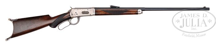 *VERY RARE, SPECIAL ORDER DELUXE WINCHESTER MODEL 1894 LEVER ACTION RIFLE. SN 303502. Cal. 32 WS. Fine deluxe ’94 with 26″ oct to rnd bbl, button magazine, half nickel front sight with screw and smokeless rear sight. Receiver, forend cap & buttplate are silver plated. Mounted with about 2X nicely figured American walnut with H-style checkered forearm and capped pistol grip stock with silver plated brass Swiss buttplate. Left side of lower tang, under the wood, is stamped with assembly number “903” and “XX. Assembly number is found in the top tang channel of the buttstock with an additional number “1034” on rear face of buttstock. No assembly number was observed in the buttplate. Accompanied by a Cody Firearms Museum letter which identifies this rifle originally in caliber 32 WS with half oct bbl and plain trigger shipped on May 26, 1906 to Order #54436. It shows repair & return on June 19, 1906 to Order #7019 with the notation “checkered stock, pistol grip, Swiss plate, silver trimmings”. PROVENANCE: Wes Adams Estate Collection. CONDITION: Very fine, all matching. Bbl retains about 98% strong orig blue. Receiver retains most of its factory silver plating with light edge wear and freckling over most of the surface, especially on left side. Forend cap retains virtually all of its orig silver plating and the buttplate about 90% silver plating. Lever & hammer retain brilliant case colors on the sides, faded on outer faces of lever. Wood is sound with several small chips in the varnish on the buttstock. Forearm retains about 70% orig varnish showing moderate wear. Buttstock retains 93-95% strong orig varnish. Mechanics are fine, bright shiny bore with some minor roughness about midpoint. 4-44360 JR3 (8,000-12,000)