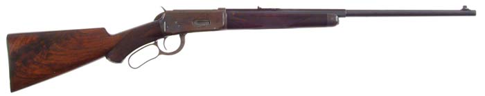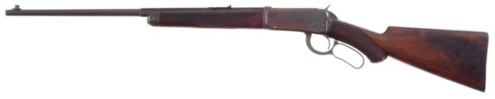 RARE EARLY SPECIAL ORDER WINCHESTER MODEL 1894 DELUXE LEVER ACTION RIFLE. Cal. 30 WCF (30-30). SN 35925. Fine special order deluxe ’94 with rare 22″ rapid taper oct to rnd bbl, button magazine with pedestal mounted Lyman ivory bead front sight & platinum-line, 3-leaf, express rear sight. Bbl has the scarce markings, in small lettering, on the left top flat by the chamber area “NICKEL STEEL BARREL/ESPECIALLY FOR SMOKELESS POWDER”. Mounted with beautiful feather crotch cut & shell grain, H-style checkered American walnut with capped pistol grip buttstock and Winchester embossed hard rubber buttplate. Left side of lower tang is stamped with the assembly number “5348” & the letters “RBOF”. Top tang channel of the buttstock has the assembly number “12069” & “T94” indicating replacement orig Winchester wood. Accompanied by a Cody Firearms Museum letter identifying this rifle as having been received in the warehouse, Dec 9, 1899 with checkered pistol grip stock, oil finish, half magazine, shotgun butt, rubber buttplate, extra light in cal. 30. It was returned to the factory Oct 17, 1901 (apparently without having been shipped) and changed to: “Rifle, 30 Caliber, 22″ half octagon barrel, plain trigger, extra light, fancy checkered stock with pistol grip, oil finish, shotgun butt, Lyman front and leaf sights” and was shipped Oct 17, 1901 to work order 111427. This explains the changed wood. This apparently was a “stock” item that languished in the warehouse and was reconfigured to conform to a new order. CONDITION: Fine. Bbl retains 95-96% strong orig blue with slight muzzle edge wear & a few scattered spots of fine pitting. Receiver retains 25-30% thin orig blue, mostly in sheltered areas with the balance flaked to a medium patina with a few small spots of fine pitting. Lever retains faded case colors on the sides, and the hammer 75-80% dark colors. Wood is sound with minor nicks & handling marks and retains most of a very fine, professionally restored, factory type oil finish. Mechanics are fine. Bright shiny bore. Goforth Collection 4-60628 (6,000-9,000)