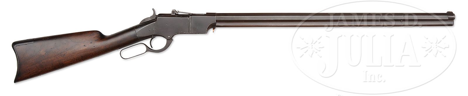 RARE HENRY MODEL 1860 IRON FRAME LEVER ACTION RIFLE. SN 78. Cal. 44 RF Henry. Fine early rifle with 24-1/4″ oct bbl that has integral magazine, slightly altered German silver front sight and early second type ladder tang sight, graduated to 900 yards without slide stop screw. Sight is mounted in top flat of receiver and there is no seat on the bbl. Trigger pin is of the early smaller size as is the brass magazine follower. Magazine follower tab slot in bottom front of the receiver is without the milled flat as found on later editions. SN is found on top flat of bbl just forward of the receiver, on left side of lower tang under the wood, inside top tang channel of buttstock and inside tang of buttplate. Buttplate is also of iron with large trap and correspondingly large hole in the wood to accommodate the orig 4-pc hickory cleaning rod that would have accompanied this rifle, which is now missing. The cleaning rod hole in the wood is beveled at the top & bottom for an unknown reason. Mounted with uncheckered straight grain American walnut with straight stock and first type iron buttplate. Left side of buttstock has a factory sling swivel with corresponding loop and orig ring on left side of bbl. Rnd part of bbl, under the loading sleeve, is marked with assembly number “225” which number is also found on rear face of the loading sleeve. Further forward on the rifle is another smaller number “229”. Screws are all matching numbered and are of the earlier thinner head style. Lever is first type without latch and appears to have an old forged repair near the hinge. Top & bottom tangs also appear to have old forged repairs, probably from the factory as those areas were weak points on the receiver. According to a chart on p. 54 of The Henry Rifle, Quick, this SN is duplicated on a brass frame Henry which is one of 16 reported duplicate numbers, attributed to clerical errors at the factory. The referenced publication indicates that the highest numbered iron frame Henry known is #355. Mr. Quick further states that as of the writing of his book (2008), there were 167 iron frame Henrys known to exist. Accompanied by a 5-page letter from renowned Winchester historian & author, George Madis, wherein he details much of the above information. Altogether a rare & desirable collectible Henry that would complement any Winchester collection or museum display. CONDITION: Very fine, all matching. Overall retains a smooth, even dark plum/blue patina with sharp edges and only a few minor nicks & scratches. Stock has repaired internal crack, not visible from the outside and is solid with a series of gouges on the bottom and overall retains a dark hand worn patina. Mechanics are fine, strong bore with good shine and scattered fine pitting with a ring about 4″ from the muzzle. 4-47623 JR137 (40,000-60,000)