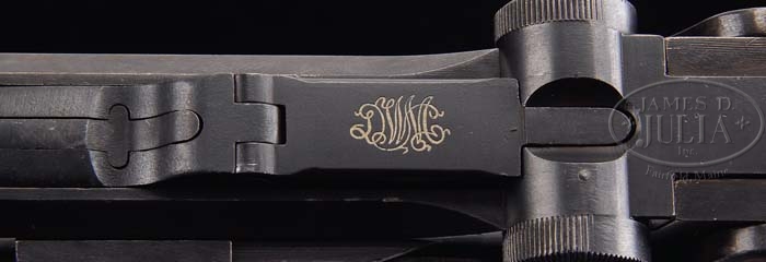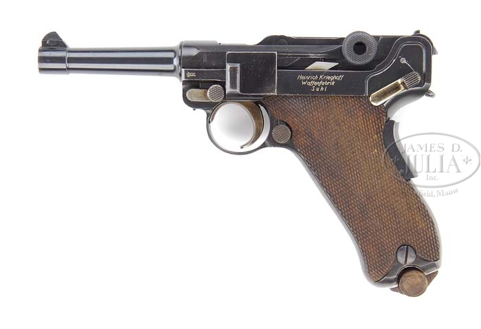 *RARE DWM I SERIES 1920 COMMERCIAL WITH GRIP SAFETY SOLD BY KREIGHOFF. SN 8459i. Cal. 30. 3-5/8″ bbl, dovetailed blade front sight, no markings over chamber and “DWM” marked toggle. Left side of frame is stamped “HEINRICH KREIGHOFF/WAFFENFABRIK/SUHL”. Safety lever is marked “GESISHERT” in bottom position. Front left side of frame is stamped with a horizontal Crown “N” proof and adjacent receiver is stamped with a vertical Crown “N” proof. There is a faint horizontal Crown “N” proof on left side of toggle. The “I” series of DWM’s between 2000-10,000 are known to be the range that Kreighoff sold. Checkered wooden grips and unnumbered wooden bottom mag. It was also made with rare grip safety and without a stock lug. All external numbered parts are matching. CONDITION: Very fine. Metal retains about 95% blue with faint sharp edgewear a small shallow area of surface oxidation on side plate. Strong straw colors thinning on take down lever and face of trigger, grips are sound with good checkering. Mechanics are crisp with a nice shiny bore. 4-38078 (4,500-6,500)