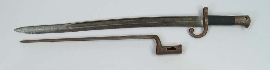 TWO BAYONETS. One with slotted end marked “US EH”. SIZE: 19”. Other with handle and long blade. Unmarked. SIZE: 28” l. CONDITION: Fair. 9-97169 (100-200)