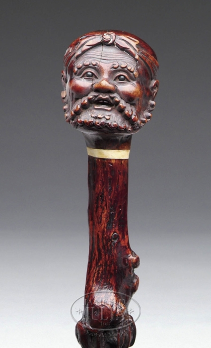 FINE CARVED HEAD CANE. Burl knotted cane with a large carved head of a man with beard, mustache and glass eyes. Nice dark patina. Bone cane ferrule and upper collar. SIZE: 39-1/2” h. CONDITION: Age cracks, otherwise very good. 9-28470 (300-500)
