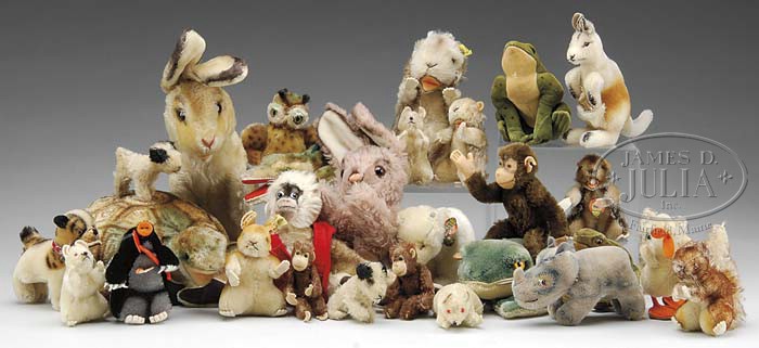 TWENTY-NINE STUFFED ANIMALS MOSTLY STEIFF. Lovely grouping of assorted animals; some still having buttons and chest tags, others not. Highlights include a large turtle, a large rabbit sitting on its haunches, nice white polar bear standing on all four and an unusual long arm monkey with googly eyes. SIZE: Tallest is 13-1/2″ (34cm). Smallest is 2″ (5cm). CONDITION: All items are very good. 1-10859-1 (500-800) Auction: Advertising, Toy & Doll - Spring 2011 Please Note: All prices include the hammer price plus the buyer’s premium, which is paid by the buyer as part of the purchase price. The prices noted here after the auction are considered unofficial and do not become official until after the 46th day. |