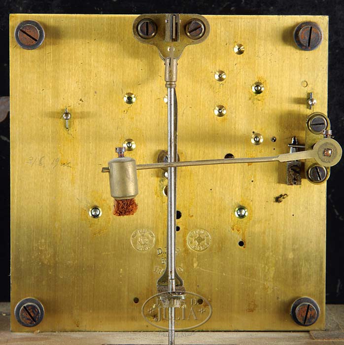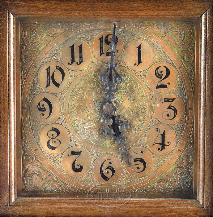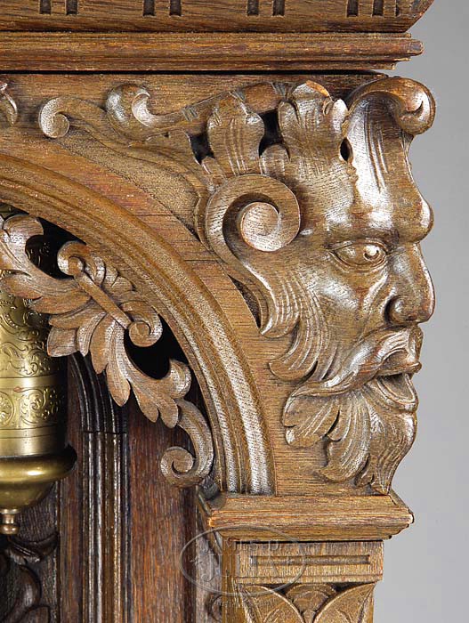 BAROQUE REVIVAL GERMAN OAK TALL-CASE CLOCK. 1st quarter 20th century. This fine hand carved example of quartersawn oak, fitted with chain-driven brass 8-day movement, stamped on the backplate with the mark of “GUSTAV BECKER FREIBURG” / “IN SCHL.” centering a crown with anchor flanked by the letters “G” and “B”. Backplate additionally stamped “D. R. P. / No. 171659” with additional serial number below “1906910”. Time and strike mechanisms with original filigree-decorated brass-clad weights, pendulum similarly decorated and wrapped in brass, square dial with Arabic numeral chapter ring, decorated overall with ornate chased scrolling foliate vinery and mythological figures. Hammer striking on a cast-brass and steel coil mounted to back of case. Bonnet with pagoda cornice, frieze applied with carved symbol of “tempus fugit” above a square glass door. Bonnet is mounted to the open case in which is displayed the weights and pendulum, carved overall with scrolling vinery, the corners carved with grotesque masks supported by robed caryatids, the base carved with molded, recessed and raised panels, flanked by engaged Ionic half-columns, all on a molded plinth. SIZE: 92-1/2″ h. x 25″ overall w. x 13-1/2″ d. PROVENANCE: Wedding gift to the Pietmeyer family, transported to this country after World War I and purchased from the family of the current owner. CONDITION: Very good condition overall, retaining original finish with dark patina. Movement, dial, pendulum and weights also original. Bracket or suppressed ball feet now absent. Two holes for dowels above the bonnet cornice signify the presence of an additional pediment, now absent. 9-95430 (3,000-5,000)