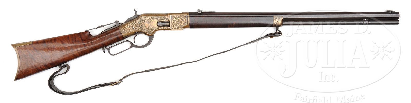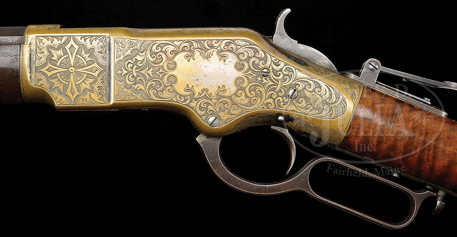 EXTREMELY RARE JOHN ULRICH ENGRAVED DELUXE WINCHESTER MODEL 1866 LEVER ACTION RIFLE. SN 36481. Cal. 44 RF Henry. Spectacular engraved ’66 rifle with 24-1/4″ oct bbl, full magazine, Rocky Mtn. front sight and 900 yard Henry-style ladder rear sight and a thin base adjustable early tang sight that has 3-3/4″ staff. Trigger is the thin pointed style usually found on engraved & deluxe rifles. Mounted with extraordinary, 3X, tiger-striped, uncheckered American walnut with straight stock & crescent buttplate with trap. Bottom of stock & forend cap have factory sling swivels. SN is found on lower tang with matching number in top tang channel of buttstock and last three digits of matching number inside toe of buttplate. Left side of lower tang, under the wood, is marked “XXX” with an “S” and an “O”. Left side of upper tang is engraved in large letters “JU”. Receiver is beautifully engraved in some of John Ulrich’s finest work with full coverage on sides consisting of very highly detailed & shaded foliate & floral arabesque patterns and has an open panel on each side with a dog’s head incorporated at left rear side and an eagle’s head at right rear side. Front side panels have full coverage engraving by the same hand in unusual patterns. Top of receiver, top & bottom tangs, bottom of receiver, forend cap and buttplate tang are also engraved and all of the engraving has an extremely fine pearled background. Receiver, forend cap & buttplate were originally silver-plated. Accompanied by what is probably its orig factory sling with brass buckle. The engraving by John Ulrich is very distinctive with fine, tight scrolls and great shading with very fine background and unusual, highly detailed panels. This represents one of John Ulrich’s finest pieces of work outside of those with deep relief engraving. CONDITION: Very fine. Bbl retains a smooth even plum patina with traces of dark blue in the most sheltered areas and one spot of pitting on left side flat toward the muzzle; magazine tube retains about 98% dark plummy/blue; receiver retains about 20-30% orig silver, mostly oxidized to dark finish; exposed brass is a medium mustard patina. Wood is sound with the forearm having a small gouge and retains a dark hand worn patina; buttstock is fine and retains most of its orig, bright piano varnish finish. Mechanics are fine, strong bore with sharp rifling and fine pitting with a ring about mid-point which has caused a very fine bulge, faintly visible on the outside. Altogether an extremely beautiful & rare ’66. Sling shows heavy wear but is still soft & supple and retains a black hand worn patina. Buckle billet has been re-stitched. 4-49008 JR139 (70,000-100,000)
