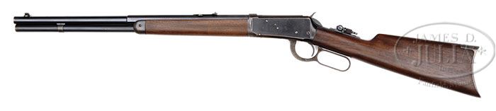 *RARE SPECIAL ORDER WINCHESTER MODEL 94 SHORT RIFLE. SN 431308. Cal. 30 WCF (30-30). Standard grade rifle with 20″ oct to rnd bbl, full magazine, Lyman ivory bead front sight, 3-leaf express rear sight with modified middle blade and a locking Lyman tang sight. Mounted with uncheckered straight grain American walnut with straight stock and crescent buttplate. PROVENANCE: Wes Adams Estate Collection. CONDITION: Fine to very fine. Bbl & magazine tube retain about 95% strong orig blue with some fine surface freckling on the bbl and dulling of the magazine tube; receiver retains about 80% thinning orig blue; lever & hammer retain bright case colors on sides fading to silver on faces; buttplate retains smoky case colors. Wood is sound and retains about all of an oil refinish. Mechanics are fine, bright shiny bore. 4-44414 JR19 (3,000-5,000)