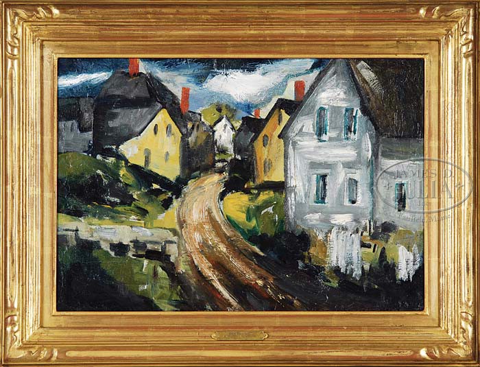 ERIC HUDSON (American, 1864-1932) “MONHEGAN VILLAGE-MAIN STREET”. Unsigned oil on canvas Monhegan street scene shows colorful buildings lining a curving road under blue and white cloud sky. Attached to back is a signed statement stating that in 1999 Greg Rollins was hired by Eric Hudson’s daughter, Jacqueline, to clean the contents of her attic. They came across this painting which was done by her father and gifted it to Greg who in turn gifted it to his father, Stephen Rollins. Signed “Stephen Rollins June 22, 2008″. Housed in a replacement carved wood frame with gilt liner having an artist plaque. SIZE: 14″ x 20”. CONDITION: Very good. 9-98724 (4,000-6,000)