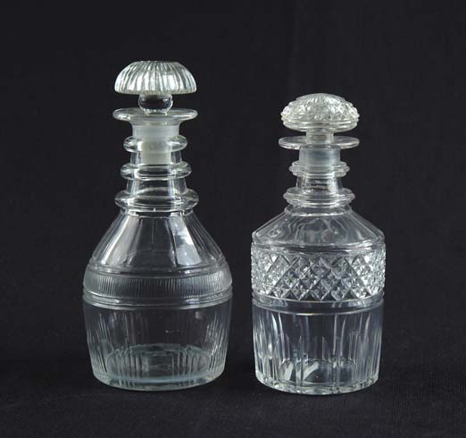 TWO STOPPERED DECANTERS. 1) Cut glass decanter has a band of diamond cut design near the faceted shoulder and neck is decorated with 2 graduated rings. Stopper has diamond design. SIZE: 7-3/4” t. CONDITION: Some chips to bottom edge of stopper, otherwise good. 2) Decanter bottle has cut design at waist of parallel vertical lines. Faceted shoulder leads to neck decorated with 3 graduated circles. Decorative stopper is cut with parallel vertical lines and smooth ground top. SIZE: 8-1/2” t. CONDITION: Small chip to rim of bottle, otherwise good. 12-204 (300-500)