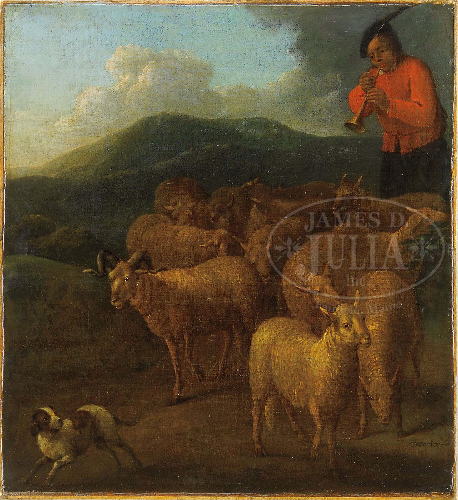 ATTRIBUTED TO DAVID TENIERS THE YOUNGER (Flemish 1610-1690) SHEPHERD WITH HIS FLOCK. Oil on canvas Unframed Signed lower right “D. Teniers FET” SIZE: 19-1/2″ x 17-3/4″. CONDITION: Relined, restored with inpainting. 9-26603 (1,000-1,500)