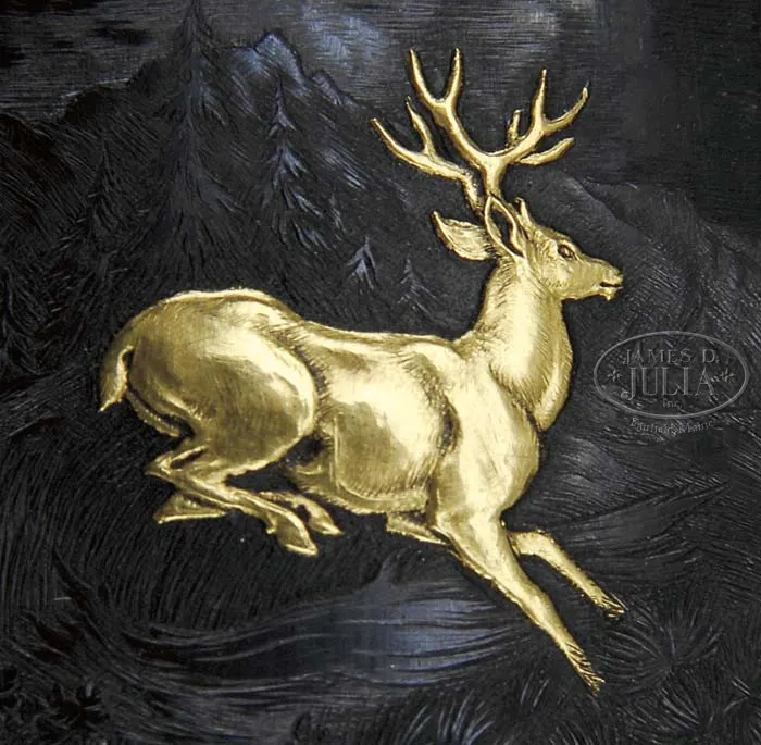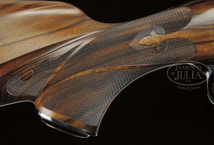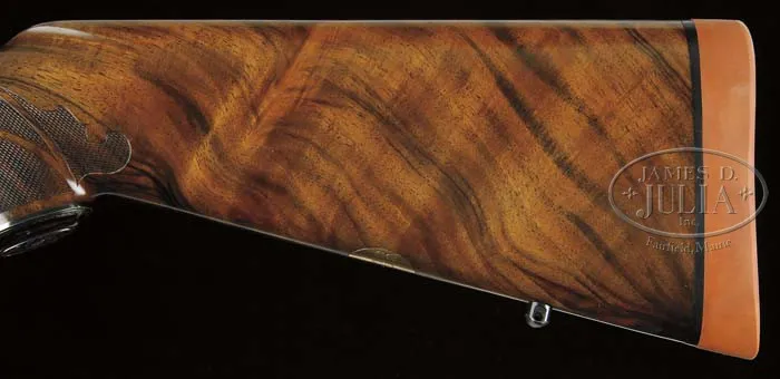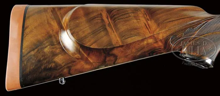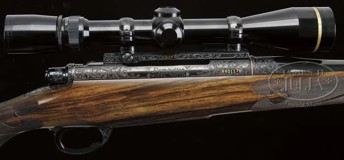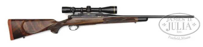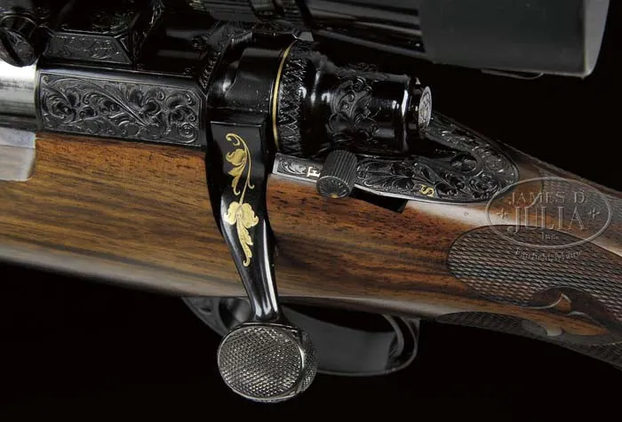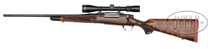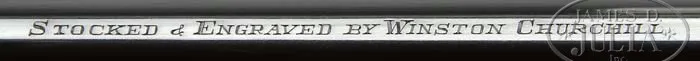 *EXTRAORDINARY WINSTON CHURCHILL STOCKED AND ENGRAVED CUSTOM REMINGTON MODEL 700 LEFT HAND RIFLE. SN 6601176. Cal. 280 Remington. This very fine sporting rifle stocked and finished by the world renown master engraver, Winston Churchill, during his earlier working years, has 22″ light sporter bbl fitted by R. Douglas, whose name is stamped on rear. Top of bbl is engraved “Stocked & Engraved By Winston Churchill”. Bbl is mated to Remington 700 left hand action. Safety lever has been slightly modified for slimmer line. Custom Blackburn bottom metal has hinged straddle floorplate with button release in trigger guard bow. Action, rear of bbl, and scope mounts are engraved with classic open flowing scrolled acanthus. Crispness of cut and nuances of shading are beyond reproach. Most parts have gold band highlights, and/ or outline with scroll terminations. Superior rendition of gold acanthus inlay is on bolt handle. Centers of floral highlights are inlaid with gold, which is an unusual touch. Truly exceptional full relief vignette of gold inlaid mule deer bounding over fallen log in high mountainous setting is central motif of floorplate. Initials “DEP” are inlaid in gold on right side of Leupold one piece scope base. SN is also gold inlaid on right side of receiver. Very fine thin-shell walnut stock has perfect grain structure from forend through grip. Butt shows fine stump figure, and very nice marbling. Stock has clean, classic lines, with little excess wood, and features large left hand sculpted shadow line cheekpiece, long ebony forend tip, engraved steel grip cap, sling eyes, and gold oval on toe line engraved “M.C.R”. Silvers type pad has been fitted. 30 LPI borderless fleur di lis checkering with ribbons through pattern, has fleur di lis accented with finely stippled shadow backgrounds. Execution of this work is beyond meticulous, and bordering on incredible. Leupold Vari-X III 3.5 x 10 scope with duplex reticle is in engraved Leupold rings. Drop at heel: approx 2-3/8″, drop at comb: approx 2-1/4″. Weight with scope: 8 lbs. 15 oz, LOP 14-3/8″. PROVENANCE: Copy of May – June 1976 RIFLE magazine article entitled “Winston Churchill explains how he built a PRESENTATION GRADE RIFLE” with all the particulars and photographs of this rifle, which was also featured on the cover. CONDITION: Excellent. All metal parts retain virtually all of their beautifully polished lustrous blue. Stock finish has dulled in some areas, with numerous minor marks and compressions from handling and use. Bore is excellent. 4-41844 MGM125 (15,000-25,000)