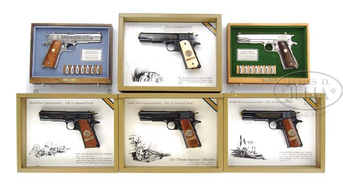*LOT OF FOUR WWI AND TWO WWII COLT 1911 AND 1911A1 COMMEMORATIVE PISTOLS. SN 7167-BW, 7167-M2, 7167-CT, 7167-MA, 7167-ETO, 7167-PTO. Cal. 45 ACP. 1)Belleau Wood. Gloss blue finish with gold filled inscriptions on each side of slide. Smooth walnut grips with medallions in each side. 2) 2nd Battle of the Marne. Nearly identical to #1 with white faux ivory grips & medallions on each side. 3) Chateau Thierry. Nearly identical to #1 with diamond checkered walnut grips & medallions on each side. 4) Meuse Argonne. Nearly identical to #1 with smooth walnut grips & medallions on each side. These four pistols all have their orig wood & Plexiglas display cases, three of which have their orig Kraft colored cardboard boxes numbered to the pistols. 5) WWII Commemorative European-African Middle-Eastern Theatre. Nickel finish with commemorative inscriptions on slide, fitted with smooth bird’s eye maple gold Colt medallion grips. 6) WWII Commemorative Asiatic-Pacific Theatre. Nickel finish with commemorative inscriptions on each side of slide and fitted with smooth gold Colt medallion walnut grips. Accompanied by its orig Kraft colored 2-pc box numbered to this pistol. The two WWII commemoratives are accompanied by their orig hinged lid glass topped display cases with removable drawers fitted for pistol, a metal plaque and seven nickel plated cartridges. CONDITION: All are new and unfired. Cases are also new. 4-38634 JR58 (6,000-10,000)