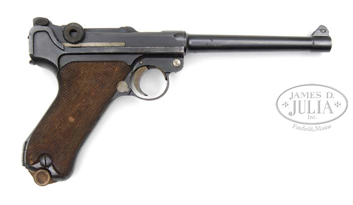 *BEAUTIFUL DWM 1916 NAVY LUGER. SN 4822. Cal. 9mm. 6″ bbl, with adjustable rear (2-position) Navy sight. Large flange fire blued rear toggle pin, DWM on center toggle link, “1916” date above chamber, left side of frame and left side of front sight, Crown/M proofs on left receiver and on bottom of bbl. Checkered walnut grips, All numbered parts are matching except for the holdopen and military proofed, numbered mag, which both appear to be period replacements. CONDITION: Retains about 98% bright blue, grip straps that are exceptionally find, Retains 95% straw, strawed parts and fired blue parts retain bright beautiful orig color. Grips are lightly worn with some dings and scuffs. Mag body is excellent and wood bottom has few minor dings. There are a few scattered areas of light corrosion which is common to this model as they spent time in service at sea. Bore is dull with light pitting. An exceptional looking WWI Naval issue Luger. 4-44317 BS53 (6,000-8,000)