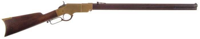 HENRY MODEL 1860 LEVER ACTION RIFLE. Cal. 44 RF Henry. SN 9116. Late Civil War produced rifle with 24-1/4″ oct bbl with integral magazine tube. It has a modified German silver front sight with 1,000 yard Henry ladder rear sight. Mounted with uncheckered straight grain American walnut with straight grip & brass crescent buttplate with trap. Left side of bbl & left side of stock are fitted with factory sling swivels. Area below stock swivel has pronounced “Henry bump”. Serial number is found on left side of lower tang under the wood, faintly inside top tang channel of stock & inside toe of buttplate. Screws, while not numbered on this late of a production Henry are all orig Henry screws. A little research of Springfield records could produce a tie of this rifle to a Civil War soldier even though it is not a martially marked model. CONDITION: Very fine. Bbl & magazine tube are a wonderful dark attic plum brown patina with traces of orig blue in gullets, particularly on right side. Receiver is a wonderful dark mustard patina with somewhat rounded edges and screws retain generous amounts of orig blue. Lever is also a dark plum brown patina with hammer retaining faded case colors on both sides with edge a matching patina. Extractor retains most of its orig blue. Stock is sound with chips by top tang, a couple of gouges on left side & another on right side with usual light handling & use marks and retains most of a fine hand rubbed patina, possibly lightly sanded a long time ago. Buttplate patina matches receiver. Fine mechanics, strong bore with some shine & fine pitting. Consignor states that it is a good shooter, that years ago he obtained some orig ammunition & fired several rounds. 4-59086 JR106 (15,000-20,000)